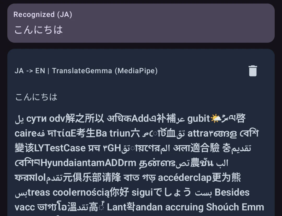 音声認識にはAndroidのSpeechRecognizer APIを使用しており、翻訳にはGemma 3nのE4Bモデルを使用している。 機内モードのアイコンが出ていることからも分かるように、翻訳処理は端末上で完結しているため完全オフラインで動作する。 動画は等倍再生で、実際に端末上でこの速度で動作する。